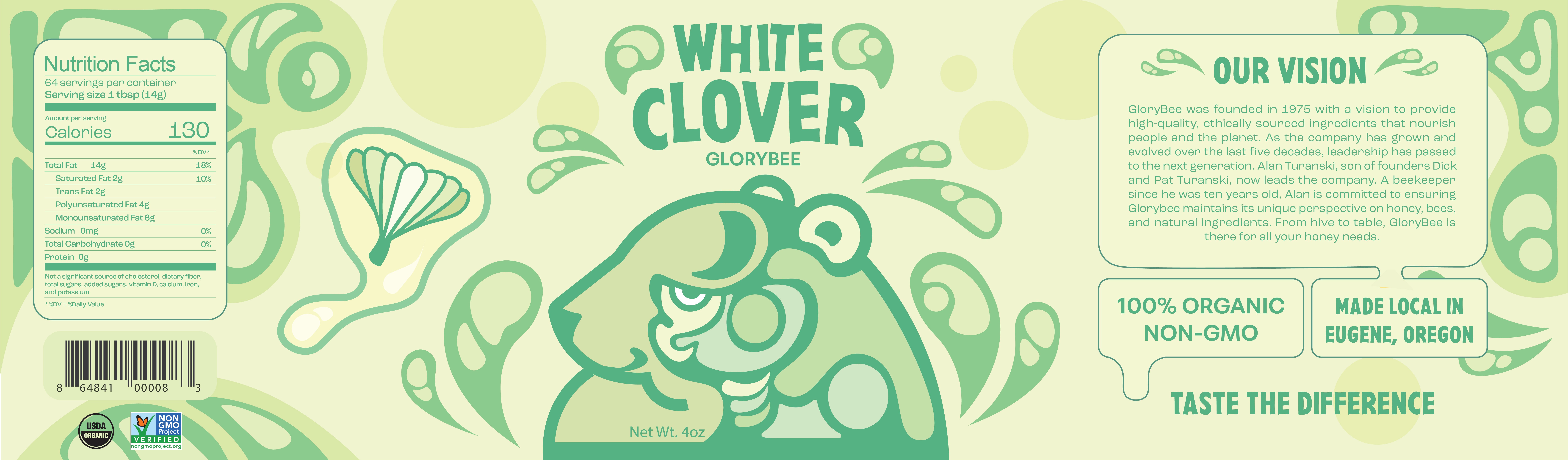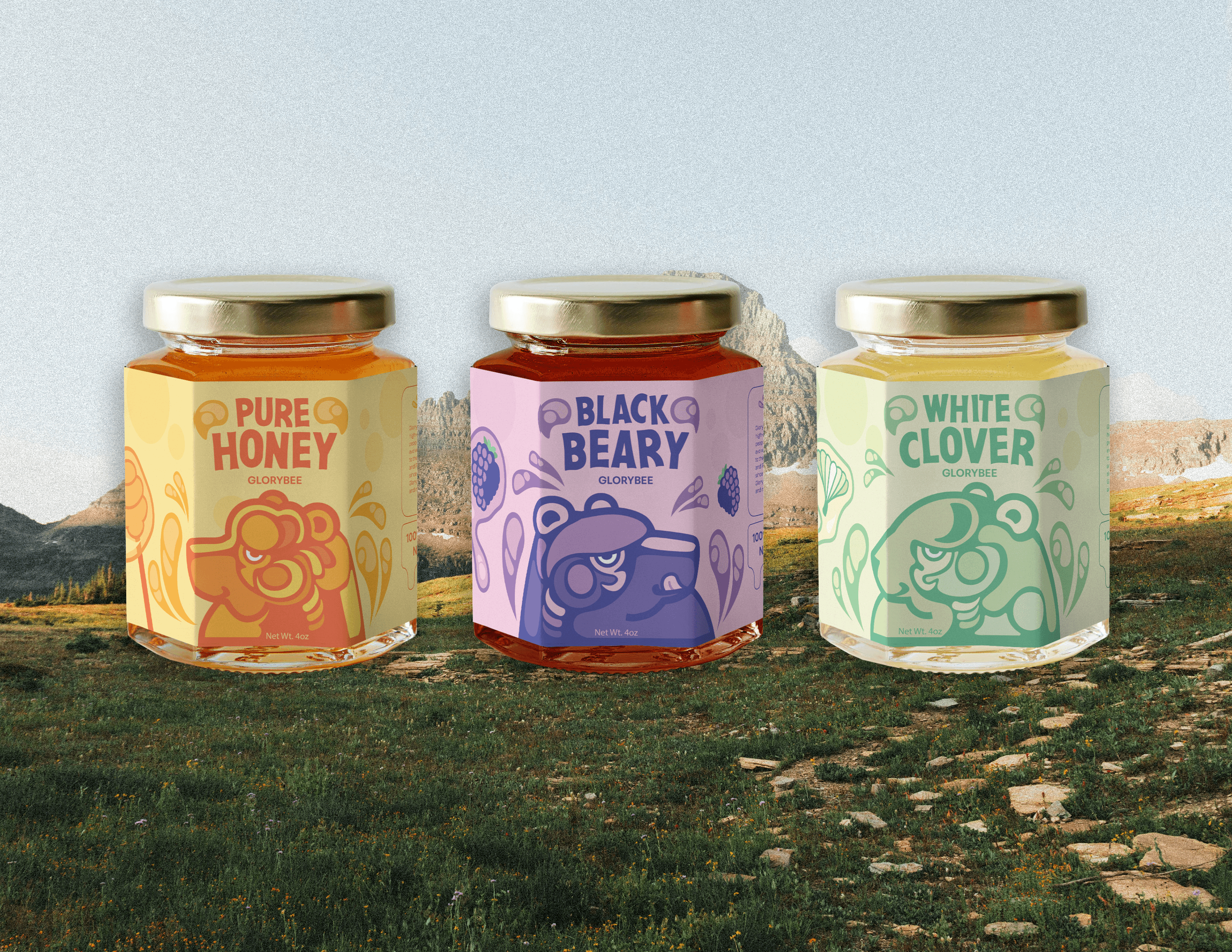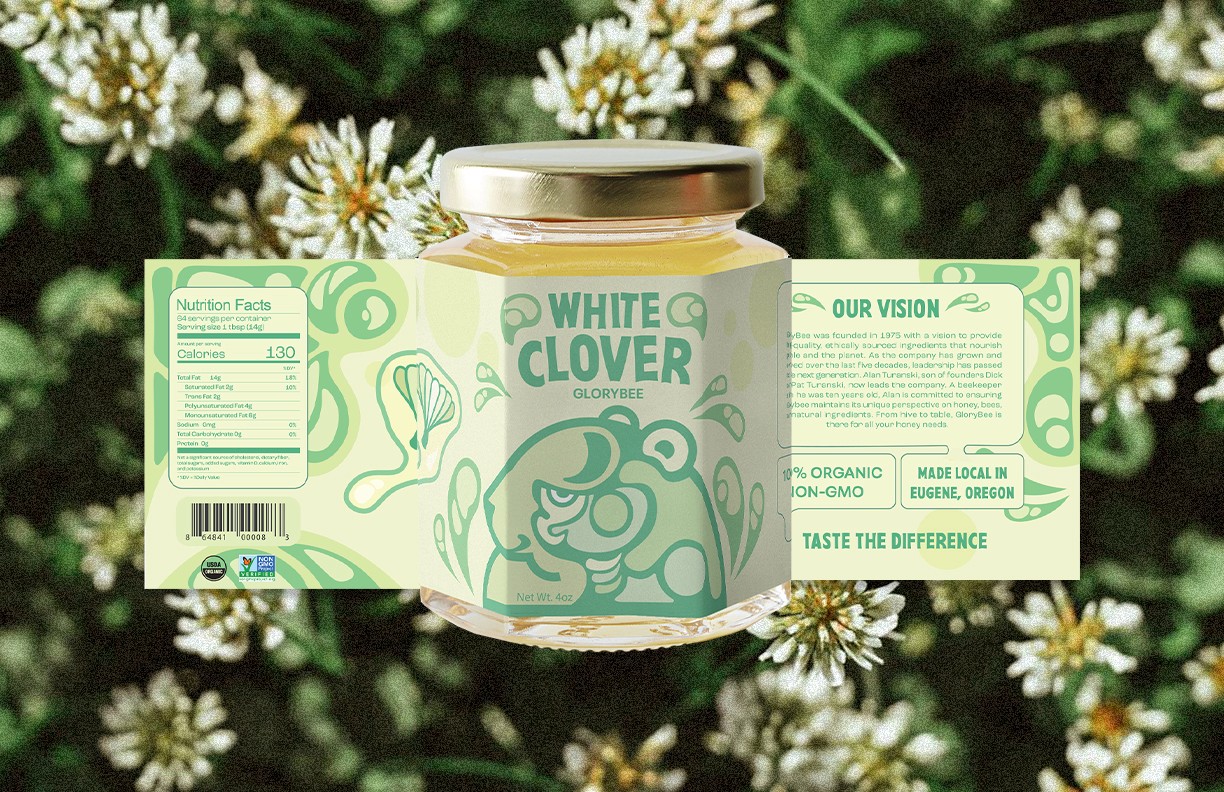 Choosing which bears to have for each flavor was also a lot of fun. Classic honey displays a classic brown bear, while the blackberry flavor is playful with a subtle pun. White clover felt like more of a challenge. I struggled initially to conceptualize the more odd flavor profile into a bear and color palette. In the end, however, I was able to use a polar bear, while pulling colors from the stems leaves found attached to white clovers.