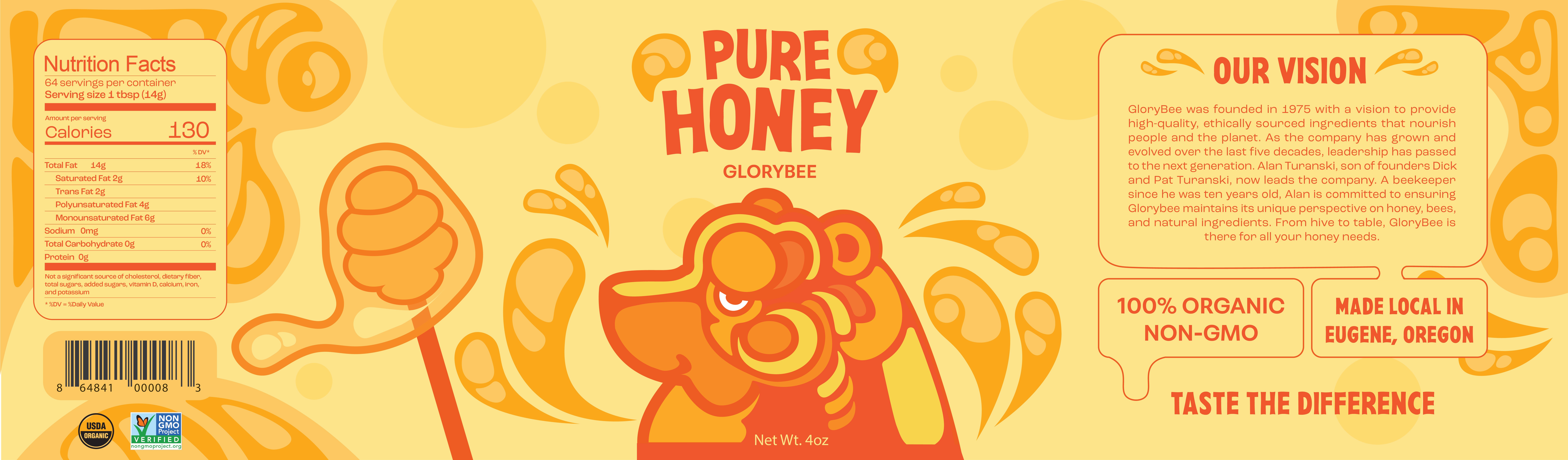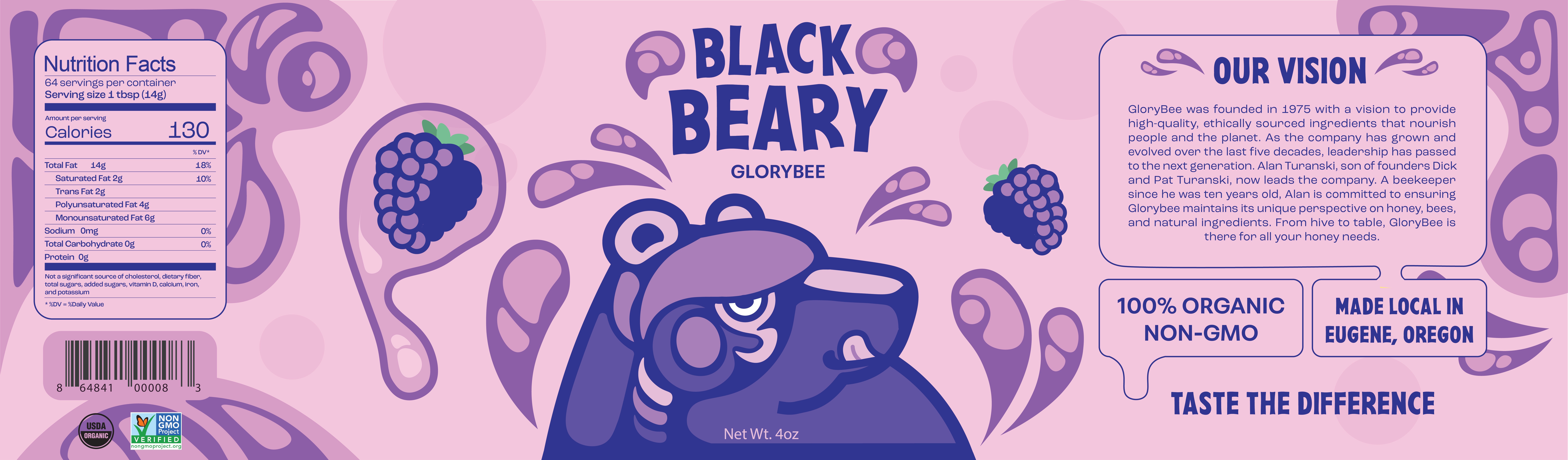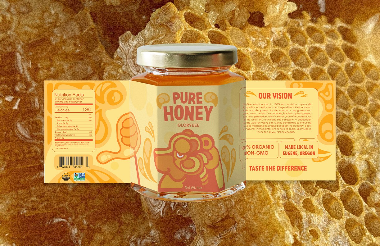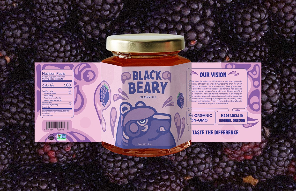 Using the well known concept of bears loving honey, I created three labels for three flavors that GloryBee provides. I aimed to have a distinct visual style and format for these labels that was easily interchangeable for each flavor.